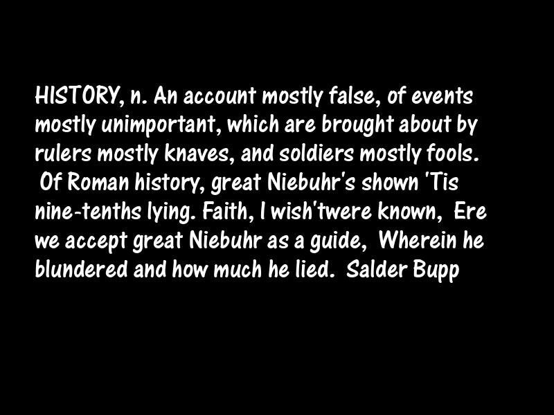 HISTORY, n. An account mostly false, of events mostly unimportant, which are brought about by rulers mostly knaves, and soldiers mostly fools. Of Roman history, great Niebuhr's shown 'Tis nine-tenths lying. Faith, I wish'twere known, Ere we accept great Niebuhr as a guide, Wherein he blundered and how much he lied. Salder Bupp