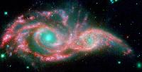 Galaxies NGC 2207 and IC 2163 met and began a slow gravitational merge about 40 million years ago. This false color image of the galaxies shows their cores in blue green and their spiral arms in bright red. Eventually, the two galaxies will become one.