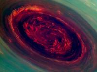 Around and around goes Saturns north polar storm as fast as 330 miles per hour (150 meters per second). This striking red photograph of the 1,250 mile wide(2,000 kilometer) storm is a false color image from NASAs Cassini spacecraft taken in November 2012. No one knows how long Saturns north polar storm has been spinning, according to NASA. Saturn periodically sports Great White Spots thousands of kilometers wide. These white cloud storms are sometimes visible by telescope on Earth.