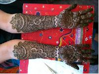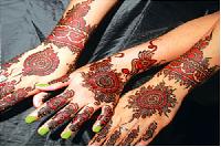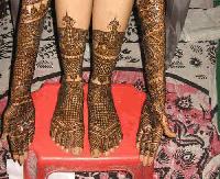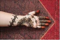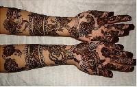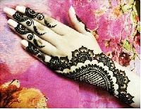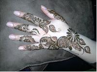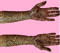 This is a bridal design that is intricately done in the Bombay style. It follows the zardosi style of jali work. It provides a very rich and ornamental look, adding to the beauty of the bride. Application of these designs requires a lot of patience both by the applicator and the person who is getting it done.