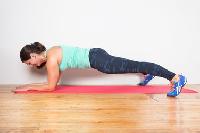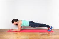 Lie facedown on the floor with feet together and forearms on the ground. Draw abs in and tighten glutes. Lift entire body off the ground until it forms a straight line from head to toe, resting on forearms and toes. Hold. Slowly return body to the ground, keeping chin tucked and back flat.