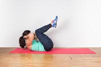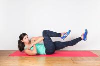 Lie faceup with legs extended and arms along sides. Raise head a few inches. Lift legs off ground, then slowly sit up, drawing knees to elbows directly over hips. Hold, then slowly lower torso and extend legs, keeping head and feet slightly off the ground.