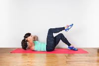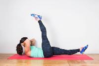 Lie on back and place hands behind ears. Lift legs to tabletop position (90-degree angle). Press lower back into floor and crunch forward until shoulders are off the floor. With toes pointed down, lower right foot as far as you can without lifting back off the floor. Return to starting position and repeat with left leg.