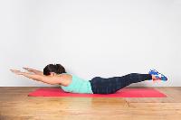 Lie facedown on floor with arms in front of body, palms toward the ground. Draw navel in, tighten glutes, and pinch shoulder blades together. Simultaneously lift arms, chest, and legs off the floor. Hold. Slowly return to ground, keeping chin tucked.