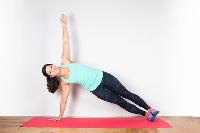 Get into push-up position. Shift weight to left hand and rotate body. Keeping feet stacked, raise right arm into the air so that arms and torso form a T Hold.