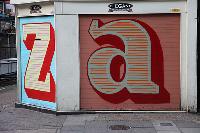 Eines best known street work is his Shutter Font (bold letters on storefronts), including a complete alphabet in London. Recently he became more known when David Cameron gave Barack Obama an Eine canvas.