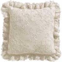Candlewicking, or Candlewick is a form of whitework embroidery that traditionally uses an unbleached cotton thread on a piece of unbleached muslin. It gets its name from the nature of the soft spun cotton thread, which was braided then used to form the wick for candles. Motifs are created using a variety of traditional embroidery stitches as well as a tufted stitch. subject matter is usually taken from nature flowers, insects, pine trees, and so on, Other traditional motifs resemble Pennsylvania Dutch or Colonial American designs. Modern designs include colored floss embroidery with the traditional white on white stitching.Loom woven or machine made candlewicks of the early 19th century are white bedcovers with designs created during the weaving process by raising loops over a small twig or tool.