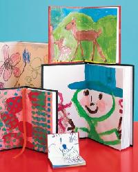 Handcrafted end papers featuring kid drawings transform basic journals into keepsakes. A journal of any size will work. Measure the books original end paper, then cut picture so that its slightly wider to accommodate the fold. Next, use a paintbrush to apply white glue evenly over the end paper. Lay artwork over glued area and press, starting at center and working out. Wipe off any excess glue; a parent can trim the edges with a utility knife if needed. Close the journal, and stack heavy books on top. Let dry overnight.