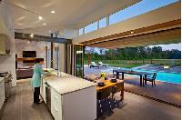 This picture shows how you can walk straight from your kitchen to your swimming pool by just having a collapsible wall between the two. The wide open space of the kitchen has been wisely used to house the long and broad kitchen table with a small dining arrangement beside it. There is also a separate dining arrangement for eating by the poolside, making it ideal for use during summer. Meals can be served hot straight from the fire if you are eating by the poolside. The two lounging chairs also look inviting and make it ideal for relaxing after a swim.