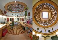 This is an ideal design concept for individuals like lawyers and doctors and offices with large collections of books who find it difficult to accommodate their tomes and volumes on available ground space. Instead of books overflowing from ground shelves, the ceiling has been innovatively used to build a five storey library that houses several hundred books if not more. The mobile ladder can be used to reach up to the ceiling as and when required and this arrangement is giving the office a clutter free look. The dome shaped ceiling has been intelligently and appropriately used and sets a standard in interior designing.
