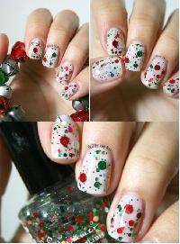 You dont have to be too obvious with the red and green combo, so a few glitter flakes on a white or beige base could be the perfect touch. If you cant find the two colors in one bottle, just get one of each and combine.