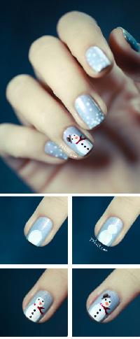 This snowman is just too cute, and I love the snowed under effect of the rest of the nails. If you dont have a superfine brush to make your jolly snowman, simply use a toothpick or bobby pin.