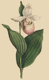 Of the genus Cypripedium, Great Britain produces only one, America several species, of these the album here figured, (whose name is derived from the whiteness of its petals, and with which the nectary must not be confounded) is by far the most magnificent, indeed there are few flowers which to such singularity of structure add such elegance and beauty it grows spontaneously in various parts of North America, and chiefly in the woods, was introduced to the royal garden at Kew, by Mr. William Young about the year 1770, but was known to Mr. Miller, and cultivated by him at Chelsea long before that period, this intelligent and truly practical author informs us, that all the sorts of Cypripedium are with difficulty preserved and propagated in gardens, he recommends them to be planted in a loamy soil, and in a situation where they may have the morning sun only, they must, he observes, for the above reasons, be procured from the places where they naturally grow, the roots should be seldom removed, for transplanting them prevents their flowering, which usually takes place in June.