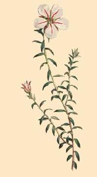 The Diosma uniflora another native of the Cape, that never failing source of vegetable riches, was introduced to the Royal Garden at Kew by Mr. Masson in the year 1775, it flowers in our Green Houses from April to June, and is usually propagated by cuttings.This plant forms a small bushy shrub, the leaves are thickly and irregularly set on the branches, quite up to the flowers, which stand singly on their summits, and are larger than those of any other known species of Diosma, expanding as we have found on trial beyond the size of half a crown, which the blossom does in our figure, though it will not appear to do so to the eye of most observers, they are without scent, the calyx is large and continuing, composed of five ovato lanceolate leaves, reddish on the upper side, and if viewed from above visible between the petals, the petals are five in number, much larger than the calyx, and deciduous, of a white colour with a streak of red running down the middle of each, surface highly glazed, the stamina are composed of five short filaments, white and slightly hairy, broad at their base and tapering gradually to a fine point, by which they are inserted into the hind part of the anther?, near the bottom, the anther? are as long as the filaments, of a brown purple colour, bending over the stigma, and opening inwardly, each carrying on the upper part of its back a gland like substance, of a pale brown colour besides these parts there are five filamentous bodies alternating with, and of the same length as the stamina, of a white colour, and hairy, each dilating at its extremity where it is of a reddish hue, and presenting towards the anther? an oval somewhat concave surface, which secretes a viscous liquid, in some flowers that we have examined, and we regret seeing but few, we have observed these nectaries (for such they may be strictly called) closely adhering by their viscous summits to the glandular substances at the back of the anther?[2], the germen is studded with a constellation of little glands, which pour forth, and almost deluge it with nectar, the stigma is composed of five little round knobs seed vessels we have not seen.
