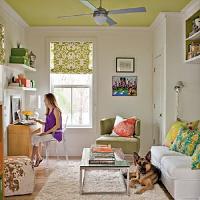 Flip tradition and paint your ceiling a bright color while leaving your walls white. Bring the color down into the space with coordinating accessories like window coverings and pillows.