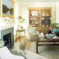 Anchor a room with a traditional rug and accessories, and then juxtapose them with modern art for a fresh feel. The hues of this heirloom rug play off of the colors of the bottle cap portrait above the fireplace.