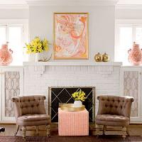Over this fireplace, a painting by the homeowners aunt provides playful color inspiration. Its coral hues are repeated in fabrics and accessories. Wallpaper remnants are placed inside the built in glass cabinets to hide DVDs and toys and provide an inexpensive style fix.