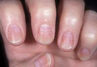 White nails liver condition,Half pink/half white nails kidney disease,Yellowing and thickening of the nail, slowed growth rate lung disease,Pale nail beds anemia,Yellow tinged nails with a slight blush at the base diabetes