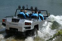 Well known Swiss sportscar tuning firm Rinspeed built an amphibious car in 2004. With complicated hydrofoil design, the vehicle can go with speed 31 mph (50 km/h) on water which is still pretty fast. Under 30 knots, the Rinspeed can cruise in water like a conventional boat. And on land it s even quicker, boasting a top speed of 124 mph (200 km/h). This amazing hydro car is powered by natural gas, and it s the first amphibious vehicle to be fueled by this environmentally friendly resource. It has a 750cc, two cylinder, turbo charged engine, and its integrated hydrofoil design can be deployed at water depths over four feet.
