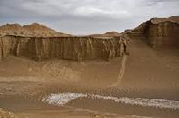 The eastern part of Dasht e Lut is a low plateau covered with salt flats. In contrast, the center has been sculpted by the wind into a series of parallel ridges and furrows, extending over 150 km (93 mi) and reaching 75 metres (246 ft) in height. This area is also riddled with ravines and sinkholes. The southeast is a vast expanse of sand, like a Saharan erg, with dunes 300 metres (980 ft) high, among the tallest in the world.