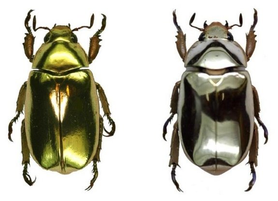 Robotic insects? The jewelry of an ancient Egyptian queen? No, these bugs are the real thing: Two species of gold and silver beetle found in the rainforests of Costa Rica. The reflective shells of Chrysina aurgians (gold) and Chrysina limbata (silver) may help the bugs blend into their damp, forest environment, which is studded with shimmering droplets of water. A new study published in the open access journal Optical Materials Express finds that the beetles shells are made of progressively thinner layers of the exoskeleton material chitin. As light passes back through each layer of chitin, the waves combine to become brighter and more intense, creating the glint of gold and silver. According to study researchers, understanding the beetles beauty may help scientists replicate it creating metallic looking materials out of organic ingredients.