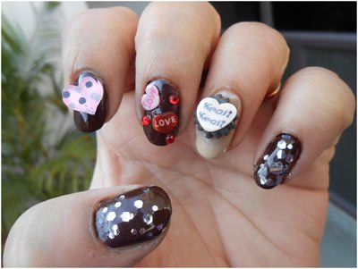 They are very easy to do. All you need is brown chocolate color nail paint and some embellishments like hearts (you can use broken hair clips) and fimo pieces. Stick them using nail glue. Also add golden glitter nail paint on your thumb and pinky.