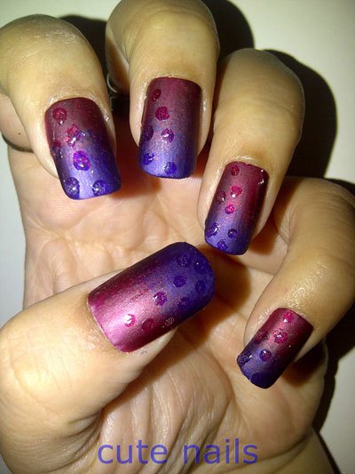 You can get this look by making maroon to purple gradient and apply matte topcoat over it, let it dry completely and then add dots of clear nail paint using toothpick at one side of your nail. Do not apply any top coat on them.