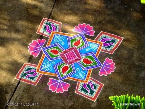 This Kolam or rangoli is another good option for Onam and other similar religious celebration in South of India. The bright blue and pink combo makes this a great choice. Also the geometric shapes used in the design makes it an easy choice for those who are new to this art.