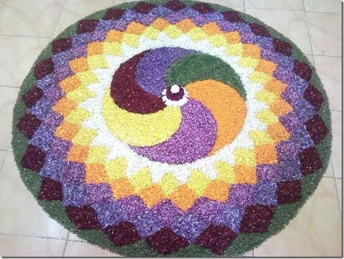 This rangoli design suits all occasions. The spiral pattern in the center and the use of various colours make this a very innovative Rangoli.