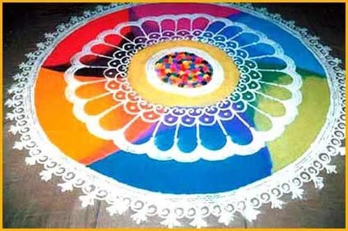 Heres a very simple yet beautiful design to start off with in our collection. Simple geometric pattern andcoloursused here range from green, yellow, blue, orange and red. This bright rangoli design is a great way to introduce colours in your home; it will instantly set the mood for celebration. Its a great choice for any festival, especiallyHoli.