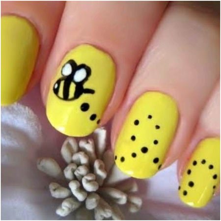 This is the variation to bumblebee nails. You can paint your nails in yellow. Then draw a little bumblebee on your middle finger and draw its flying path using black dots across ring finger and pinky.