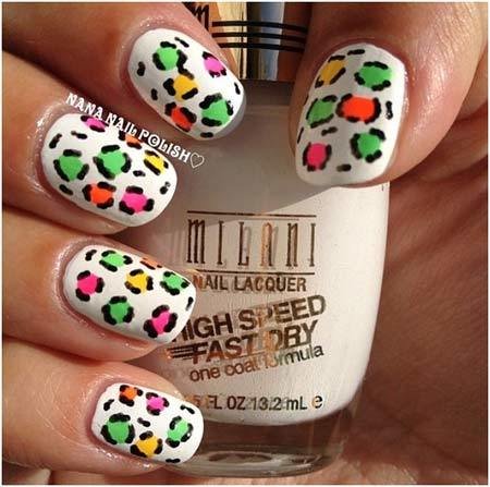 Neon leopard print nails look fabulous in summer. To get this look, just paint your nails white and add some random dots in different neon shades. Now outline the neon dots in c shaped strokes with black color and add few random black spots here and there. Apply a topcoat.