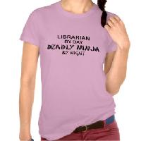 Designed by Poor Richard. The tshirt features a funny text: Librarian by day, deadly ninja by night. Not only tshirts, but also other apparel is available with this design, including long sleeve tees, polos, tank tops, and sweatshirts. For women, men, and kids.