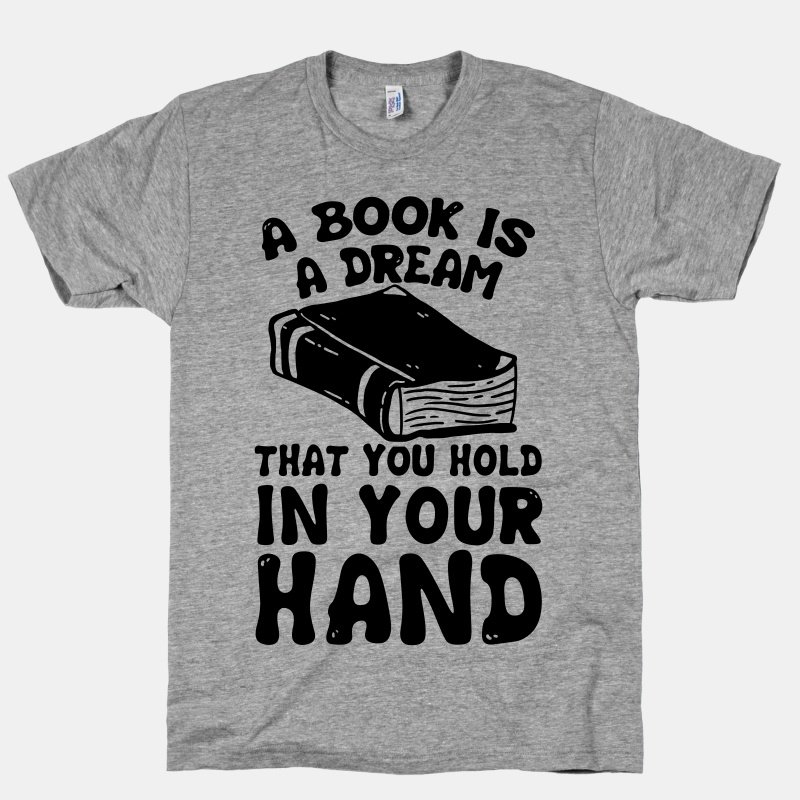 One of the iconic designs by Risa Rodil, and sold by Society6. This time a quote by Neil Gaiman is visualized: A book is a dream you hold in your hands. The art work is printed on premium American Apparel shirt. Made from ultra soft 100% fine jersey cotton. Three colors to choose from: Black, White (not recommended), and TriBlack (shown above). Sizes from S to XL.