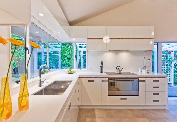 The materials used for this contemporary Los Angeles kitchen is really stunning. From the ceiling lighting to the corner window, from the double bowl sink to the modern kitchen appliances, who would not love this modular kitchen design.