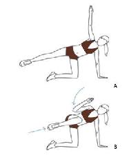 (A) Begin with left knee and left hand on the floor, right arm straight up. Extend right leg so your body forms a straight line. (B) Pull right knee toward torso and right elbow toward knee. Straighten arm and leg. Repeat 10 times, then switch sides.