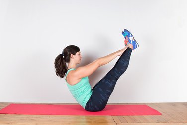 Lie faceup with legs and arms extended. Keeping knees and elbows locked, simultaneously raise upper body and lower body while trying to touch fingers to toes.