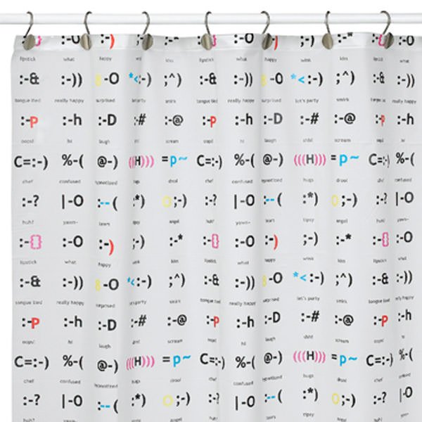 This shower curtain from Bed Bath & Beyond is a fun addition to your bathroom. Almost all emoticons are clad on the Text Talk curtain, including many Ive never even used.
