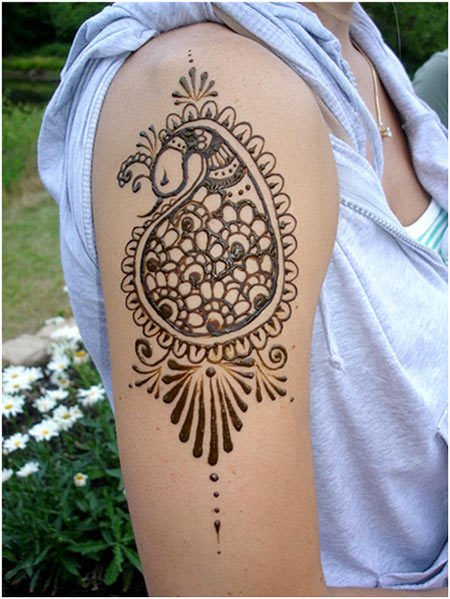 A peacock inspired tattoo design for all of those who love tattoo mehndis. Tattoo mehndi is a great way to add some colour without pain and as they are not permanent, you can remove them once you get bored of them. This mehndi tattoo is done with black mehndi and features the peacock design on the hand.