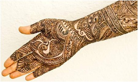 Here is a beautiful peacock mehndi design for the bride. The design looks beautiful with a lot of details and unique designs on the fingers. The tips are kept open and the design is done with black mehndi to make the details stand out.