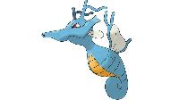 Kingdra evolves from Seadra when holding a Dragon Scale. It is a water dragon Pokemon and is a dual type creature. It is in fact the final form of Horsea. This is a seahorse like large Pokemon, with a curled tail. This sea horse is no easy target. True to being like a dragon, Kingdra is one fierce fighter. It is typed in such a way that it has hardly any major weaknesses. Kingdra has blue scales and has yellow belly scales which are compact. Its snout is thin but very powerful. The snout allows squirts of water to be fired with devastating and overwhelming power. There are also thin spines all over, with a single spine on its head and also white fins under its cheeks.