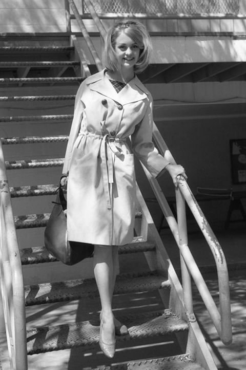 Fresh faced and bubbly as ever at just 19, the then dancer Goldie Hawn added an air of sophistication to her bouncy bob and sweetheart smile with a classic trench and pointy toed flats.
