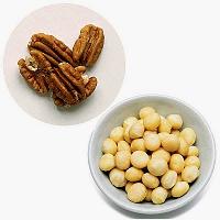 Ounce for ounce, macadamia nuts (10 to 12 nuts 2 grams protein, 21 grams fat) and pecans (18 to 20 halves 3 grams protein, 20 grams fat) have the most calories?200 each?along with the lowest amounts of protein and the highest amounts of fats.
