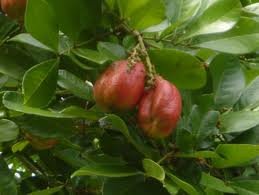 The fruit is pear-shaped. When it matures, it changes from green to a shiny red to yellow-orange, and breaks open to disclose three big, bright black seeds, circled by soft, creamy or sponge like, white to yellow flesh.