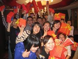 In addition to red envelopes, which are usually given from elder to younger, small gifts (usually of food or sweets) are also exchanged between friends or relatives (of different households) during Chinese New Year. Gifts are usually brought when visiting friends or relatives at their homes. Common gifts include fruits (typically oranges, and never pears), cakes, biscuits, chocolates, candies, or some other small gifts.