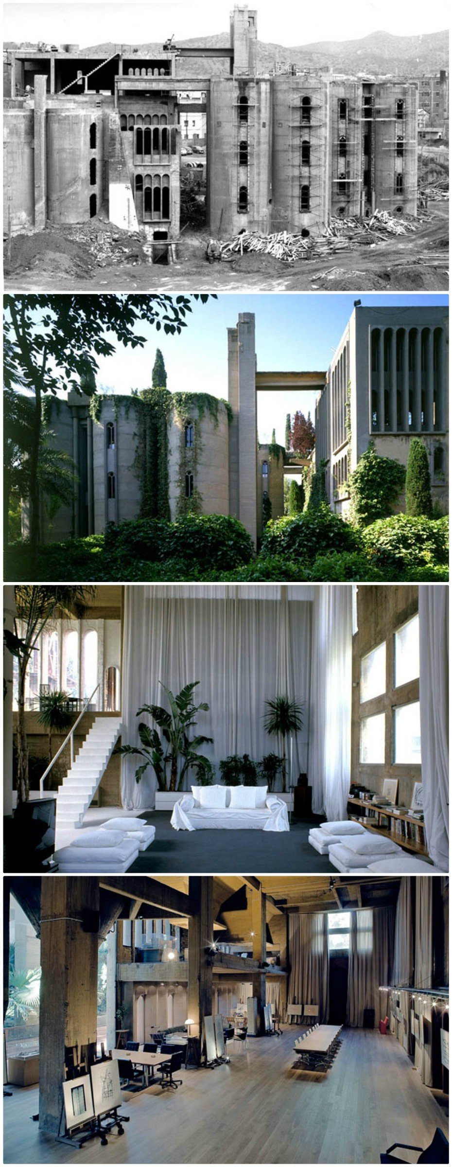 Ricardo Bofill rescued this cement factory in Barcelona, Spain from near ruin. Now 30 silos, multiple buildings and towering ceilings are home to Bofills residence, headquarters of his business, and an exhibition hall.