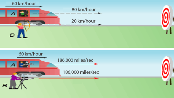 Going back to the bus example. If you were to shoot an arrow out the window at a target down the road in front of you how fast would it be moving when it hit hit the bullseye? Well, essentially it would be going the speed of the bus about 60 km per hour plus however fast you shot the arrow. Now what if you shined a beam of light at it? Since the light travels at 186,000 miles per second, we would just add the 60 km per hour right? Wrong. Scientist found that no matter what, light travels the same speed. Which brings us to our next point.