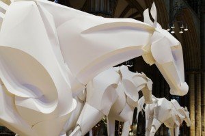 Richard Sweeny is a three-dimensionalsculpturist who creates breathtaking life-sized figures. Sweeny's latest collection, Dreams of Gold, depicts horses and chariots and is being displayed inside the Lincoln Cathedral in the UK for an Olympic-inspired flower festival. The giant horses are made of paper! Sweeny first constructs a flexible wooden skeleton, then covers it with a paper skin.