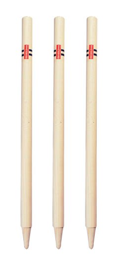 These are three wooden poles of height 28 inches. It has a conical bottom and a horizontal groove across the top end. There are three stumps at each end, with two bails sitting across the top of them and are equally spaced to cover a width of 9 inches.