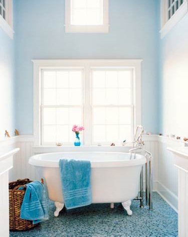 Pure as a Shaker church, a Nantucket beach house blue master bathroom gets its airy look from high ceilings and walls painted with Farrow & Ball Borrowed Light.Designer Frank Roop drew the mosaic tile floor on a computer with CAD software, and Tile Showcase manufactured it in one piece, like a carpet.